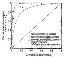 Рис.18. Состав поверхностного слоя на латексных частицах в зависимости от состава смешанного раствора ПАВ, содержащего NP-Ejо и ДСН. Адсорбция на полистирольном и полибутилметакрилатном латексах. Штриховая прямая отвечает равному распределению между поверхностью и раствором; пунктирная линия - распределение, рассчитанное в предположении отсутствия взаимодействия между поверхностно-активными веществами). Сплошная линия - расчет с учетом взаимодействия между ПАВ