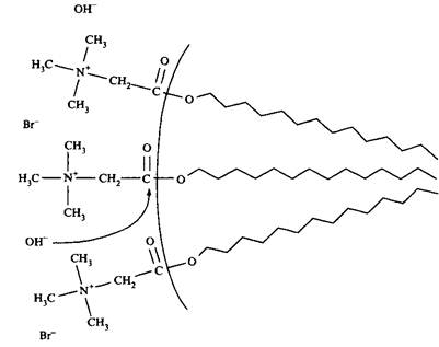 Рис. 4. Мицеллярный катализ обусловлен высокими концентрациями реагентов на поверхности мицеллы. Гидроксид-ионы могут вытесняться не участвующими в реакции ионами, например бромид-ионами, тогда каталитический эффект исчезает