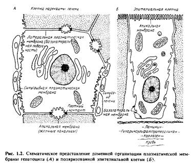 Апикальный, латеральный и синусоидный участки плазматической мембраны различаются морфологически и имеют уникальный состав и функции. Если клетки разрушить в мягких условиях, то можно выделить и очистить фракции, отвечающие этим участкам плазматической мембраны. Как на молекулярном уровне обеспечивается в клетке существование таких специализированных доменов, пока неясно, хотя известно, что не все их компоненты способны свободно диффундировать между доменами.